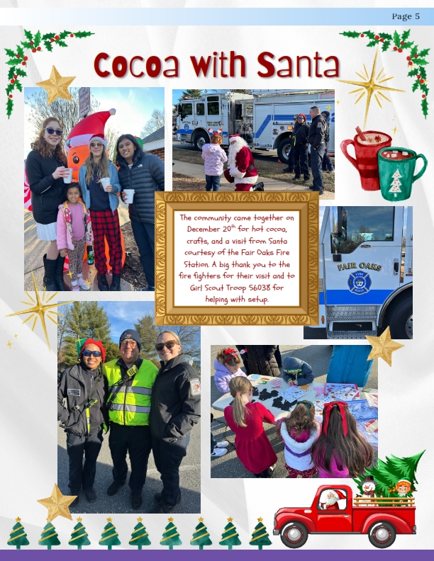 - Cocoa with Santa / visit with firefighters – Saturday Dec 20th, 2:30-3:30pm